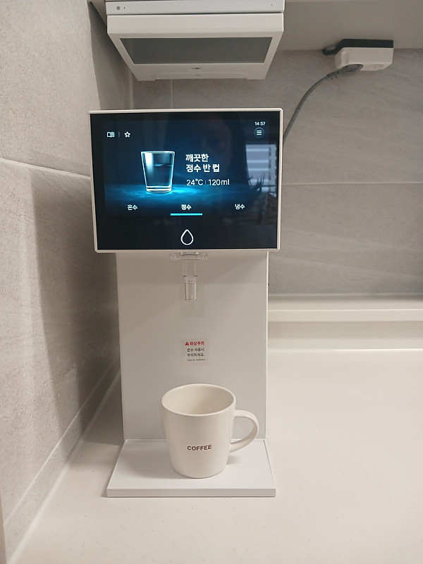 사진에서 보이는거처럼 모든 화면이 터치스크린이여서 엄청 신기했어요! 원하는 온도와 물양을 보고 누르기만하면 자동으로 맞춰줘서 사용할때 더 편한듯한 느낌이에요! 무엇보다 너무 세련되보여서 인테리어 용으로도 너무 만족스럽고 지인들이 볼때마다 신기해해서 더 뿌듯해요!